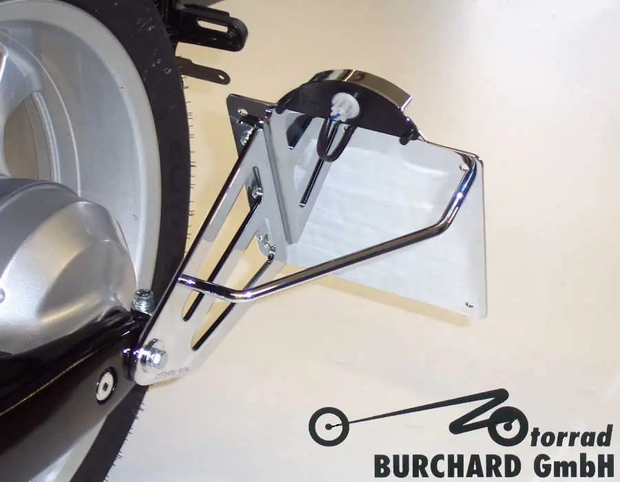 Der seitliche Kennzeichenhalter wird vormontiert mit allen zur Montage erforderlichen Teilen ausgeliefert. Unsere seitlichen Kennzeichenhalter werden aus Stahl gefertigt und sind wahlweise in hochglanz Chrom, schwarz glänzend pulverbeschichtet oder schwarz matt pulverbeschichtet erhältlich. Um beim pulverbeschichten eine Korrosionsbeständigkeit wie beim verchromen zu erreichen, werden die Fußrastenanlagen vor der Pulverbeschichtung galvanisch vernickelt. Alle seitlichen Kennzeichenhalter werden mit einer schwarzen LED Kennzeichenleuchte ausgeliefert. Die Kennzeichenleuchte hat ein E-Prüfzeichen und ist zusätzlich im Gutachten aufgeführt. Die Kennzeichenhalter sind aus Stahl gefertigt und werden in Chrom, schwarz glänzend oder schwarz matt pulverbeschichtet angeboten „Made in Germany“. Der Kennzeichenhalter wird mit einem TÜV Teilegutachten nach § 19/3 StVZO, einer Montageanleitung und einer Stückliste geliefert. Alle abschraubbaren Teile sind als Ersatzteil lieferbar.
