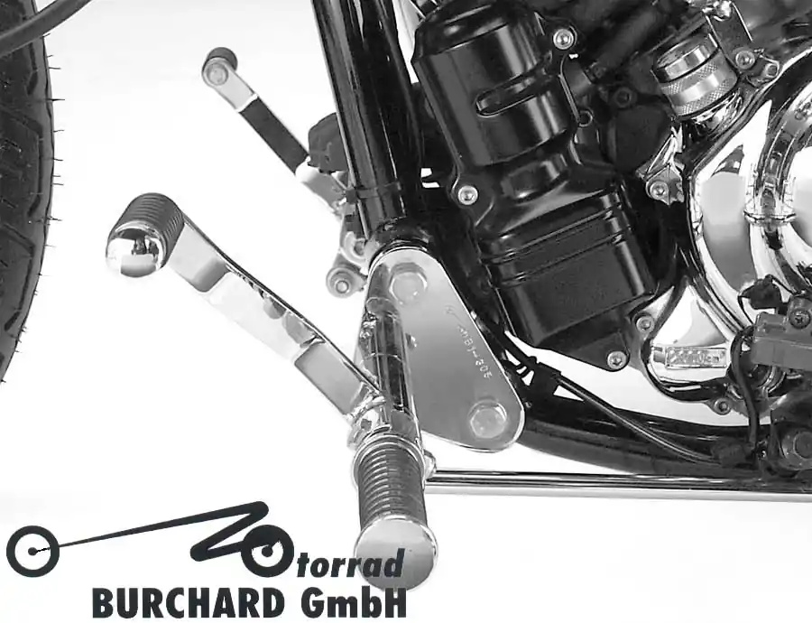 Die Fußrastenanlage wird vormontiert mit allen zur Montage erforderlichen Teilen, wie z.B. einer verlängerten Bremsleitung (wenn nötig), ausgeliefert. Die Montage erfolgt an den originalen Rahmenhaltepunkten. Unsere Fußrasten werden aus Stahl gefertigt und sind wahlweise in hochglanz Chrom, schwarz glänzend pulverbeschichtet oder schwarz matt pulverbeschichtet erhältlich. Um beim pulverbeschichten eine Korrosionsbeständigkeit wie beim verchromen zu erreichen, werden die Fußrastenanlagen vor der Pulverbeschichtung galvanisch vernickelt. Alle Motorrad Burchard Fußrastenanlagen werden mit einer 2-Jahresgarantie auf Verarbeitung und Verchromung geliefert. Schalt- und Bremshebel sind per Hand eingepasst und mit Schmiernippeln versehen. Kraftübertragende Verbindungsteile (Kugelgelenke) an den Schalt- und Bremsstangen sind spielfrei und ebenfalls mit Schmiernippeln ausgerüstet.