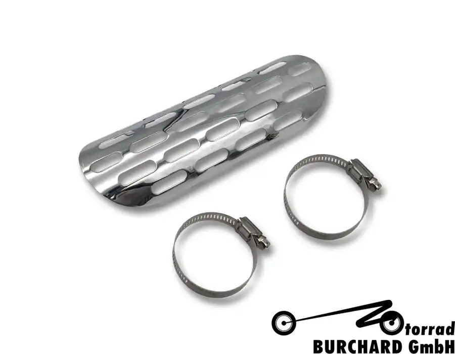 Im Lieferumfang enthalten: 1 x Hitzeschild in chrom und Befestigungsschellen