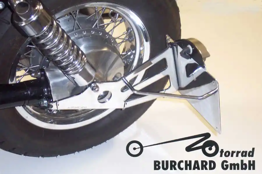 Der seitliche Kennzeichenhalter wird vormontiert mit allen zur Montage erforderlichen Teilen ausgeliefert. Unsere seitlichen Kennzeichenhalter werden aus Stahl gefertigt und sind wahlweise in hochglanz Chrom, schwarz glänzend pulverbeschichtet oder schwarz matt pulverbeschichtet erhältlich. Um beim pulverbeschichten eine Korrosionsbeständigkeit wie beim verchromen zu erreichen, werden die Fußrastenanlagen vor der Pulverbeschichtung galvanisch vernickelt. Alle seitlichen Kennzeichenhalter werden mit einer schwarzen LED Kennzeichenleuchte ausgeliefert. Die Kennzeichenleuchte hat ein E-Prüfzeichen und ist zusätzlich im Gutachten aufgeführt. Die Kennzeichenhalter sind aus Stahl gefertigt und werden in Chrom, schwarz glänzend oder schwarz matt pulverbeschichtet angeboten „Made in Germany“. Der Kennzeichenhalter wird mit einem TÜV Teilegutachten nach § 19/3 StVZO, einer Montageanleitung und einer Stückliste geliefert. Alle abschraubbaren Teile sind als Ersatzteil lieferbar.