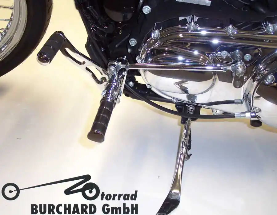 Die Fußrastenanlage wird vormontiert mit allen zur Montage erforderlichen Teilen, wie z.B. einer verlängerten Bremsleitung (wenn nötig), ausgeliefert. Die Montage erfolgt an den originalen Rahmenhaltepunkten. Unsere Fußrasten werden aus Stahl gefertigt und sind wahlweise in hochglanz Chrom, schwarz glänzend pulverbeschichtet oder schwarz matt pulverbeschichtet erhältlich. Um beim pulverbeschichten eine Korrosionsbeständigkeit wie beim verchromen zu erreichen, werden die Fußrastenanlagen vor der Pulverbeschichtung galvanisch vernickelt. Alle Motorrad Burchard Fußrastenanlagen werden mit einer 2-Jahresgarantie auf Verarbeitung und Verchromung geliefert. Schalt- und Bremshebel sind per Hand eingepasst und mit Schmiernippeln versehen. Kraftübertragende Verbindungsteile (Kugelgelenke) an den Schalt- und Bremsstangen sind spielfrei und ebenfalls mit Schmiernippeln ausgerüstet.